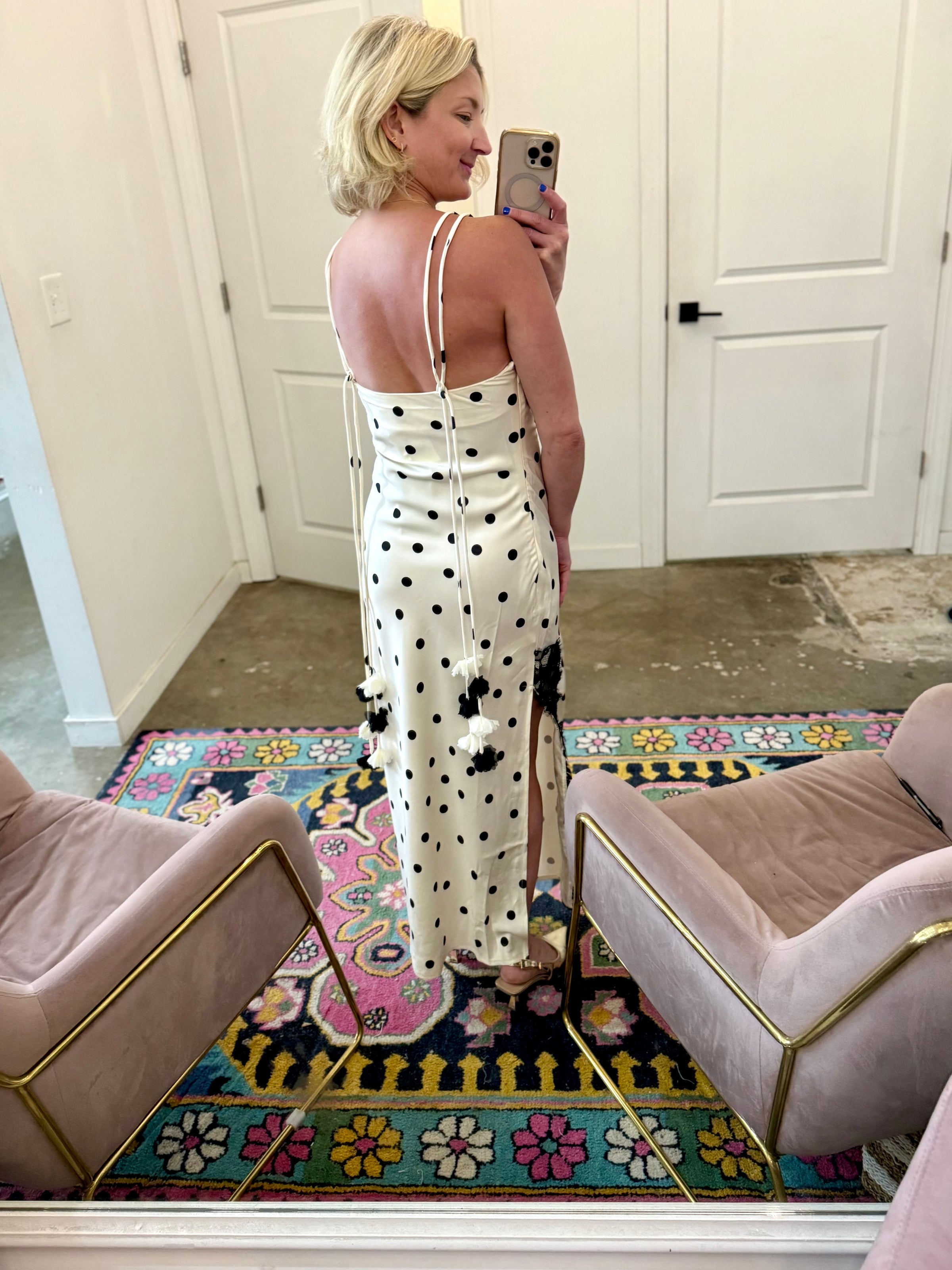 The Polka Lace Midi features a black and white polka dot satin design that combines elegance with playfulness, enhanced by adjustable back tassels. The side slip with lace detail adds sophistication, while the flattering cowl neckline ensures a refined silhouette, making it suitable for various occasions.